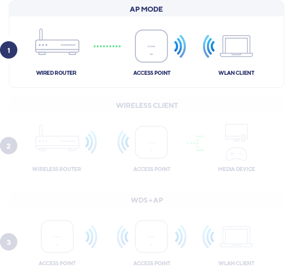 Access Point (AP) WDS bridge WDS with AP Wireless client |