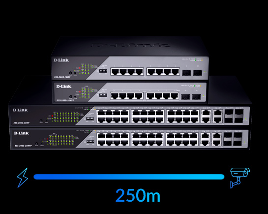Contrairement aux switches PoE traditionnels qui n’envoient de l’alimentation et des données que sur une distance de 100 m, les switches PoE longue portée offrent une distance considérablement accrue allant jusqu’à 250 m. Idéal pour les caméras de surveillance qui doivent être déployées à une distance beaucoup plus éloignée du switch. Et si une plus grande distance est nécessaire, l’utilisation d’un prolongateur PoE peut augmenter la distance jusqu’à 650 m maximum.